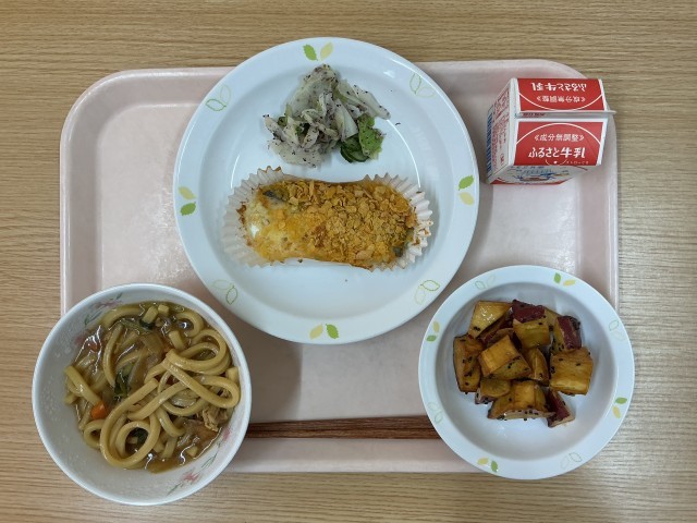 今日の献立・・・カレーうどん、ホキのコーンフレーク焼き、ゆかり和え、大学芋、牛乳