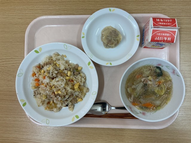 今日の献立・・・焼き豚チャーハン、ジャンボしゅうまい、白菜と春雨のスープ、牛乳