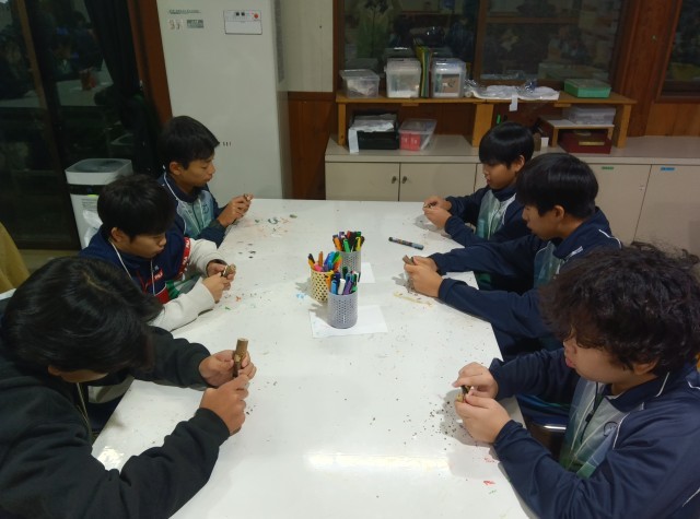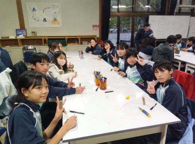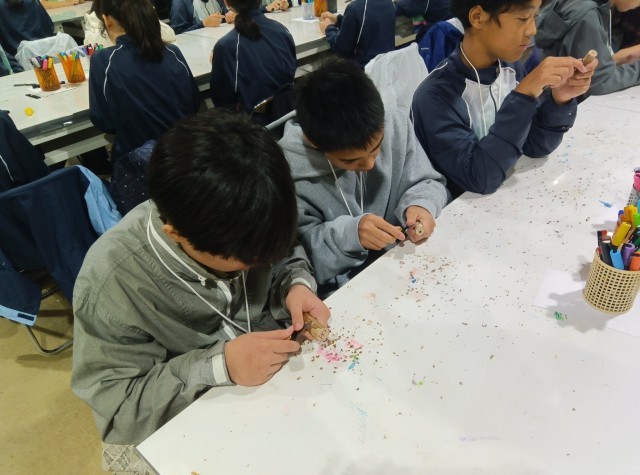 ガイドウォークの裏では、バードコール作りを行っています。木をカッターで削って色を付けていきます。