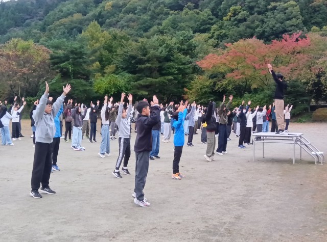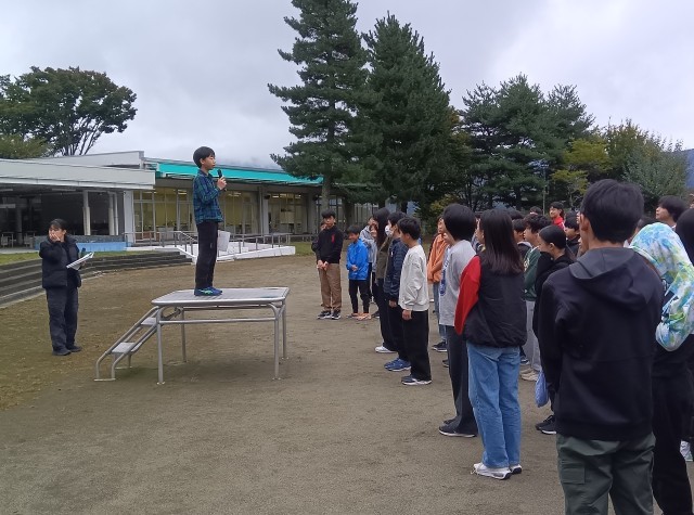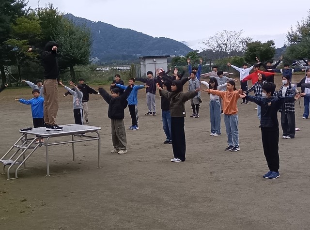 朝礼です。実行委員が司会進行、ラジオ体操を進めています。みんな元気です!