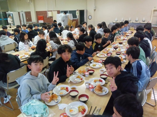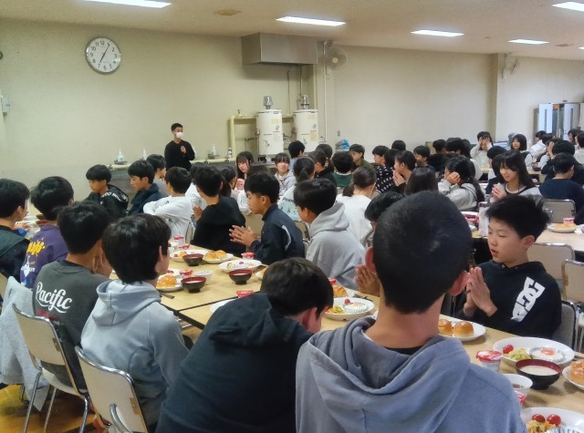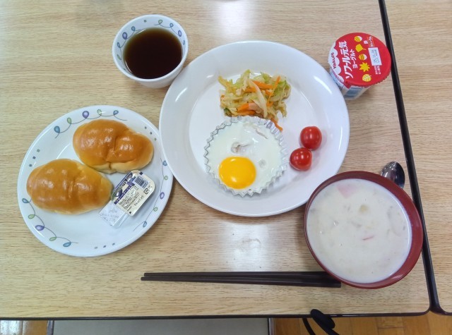 今朝の朝食は洋食です。代表生徒のあいさつの後「いただきます!」さあ、しっかり食べよう!