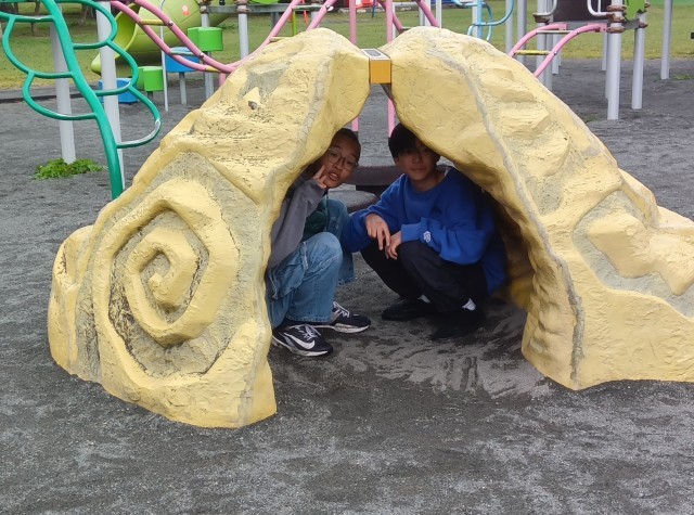 「もちや」では、食事、お土産、園庭で遊ぶ、の3ローテーションです。園庭には芝生が広がり、遊具などもあってのびのびと遊べます。後半天候が崩れて園庭で遊ぶことができないクラスもあり、残念でした!
