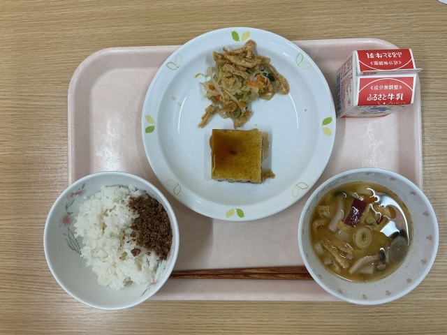 今日の献立・・・ご飯、お魚ふりかけ、擬製豆腐、カリカリ油揚げのサラダ、いなか汁、牛乳
