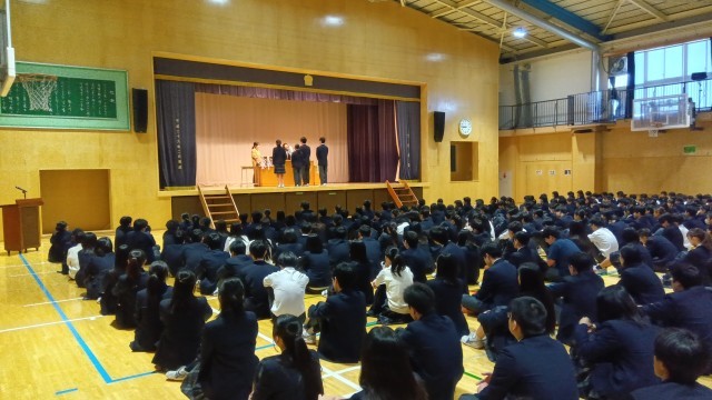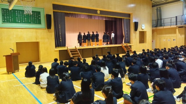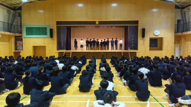 区陸上大会、技術家庭科、生徒競書会、ソフトテニス部、卓球部、バスケットボール部が表彰されました。