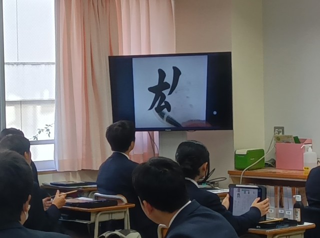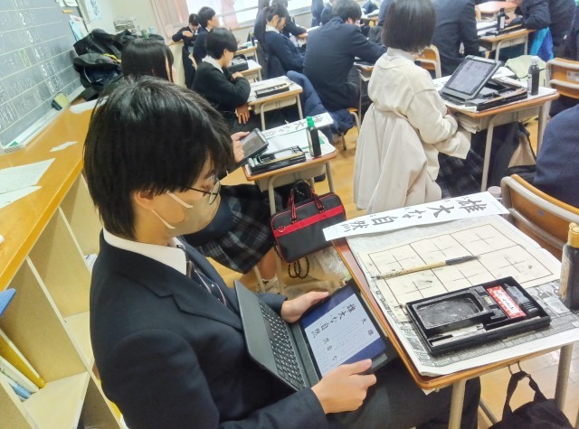 3年生は書道(書き初め)に取り組んでいます。今日は第一回め。指定された楷書、行書の文字を書くポイントを、iPadで送られた資料や動画を見てイメージします。