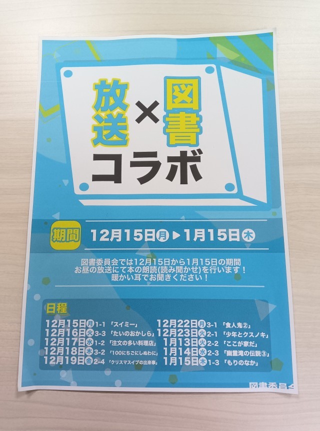 12月15日から1月15日の期間、図書委員会と放送委員会のコラボ企画として、お昼の放送にて本の朗読(読み聞かせ)を行っています。今日は「100にちごにしぬわに」の朗読でした。放送委員は一生懸命朗読しています。教室のみんなはちゃんと聞いてくれているかなあ。