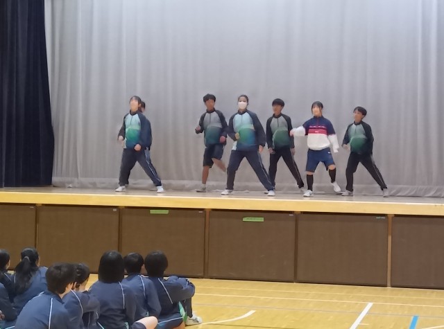 ダンスの講師を招いての授業も今日が最終。規定のダンスに加えて自分たちのオリジナルを加えたダンスを各班で披露します!最初とは比べられないくらい滑らかな動きです。短い時間でしたが、ダンスの面白さと難しさ、みんな感じ取ることができたでしょうか。