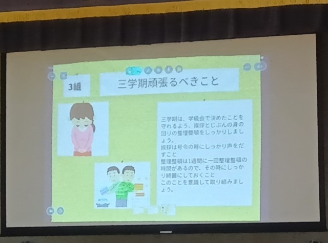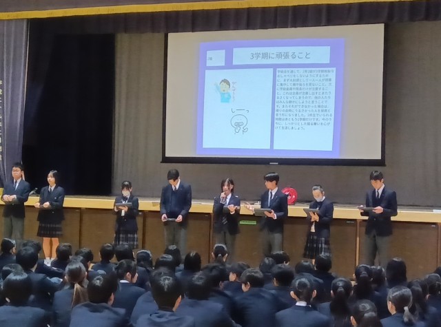 2年生の学年集会では、各クラス事前に実施したアンケート結果をもとに、「今学期よかったこと、反省すべきこと」「3学期に向けて」について学級委員が発表していました。データをもとにした発表、素晴らしいですね!