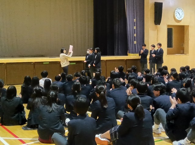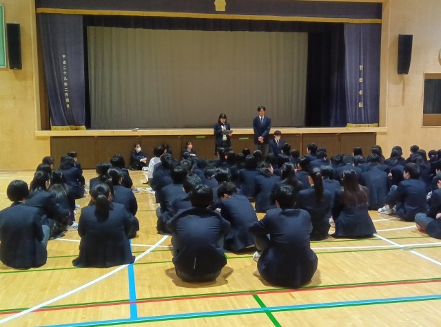 3年生の学年集会は、司会から各クラスの2学期の振り返りまで、すべて学級委員が中心になって進めます。学年集会の最後には、生徒たちが秘密裏に進めたプロジェクトが実行されました!それは1月から産休に入られる先生を送る会でした。生徒たちの温かい心遣いに、送られる先生もとても幸せそうでした!