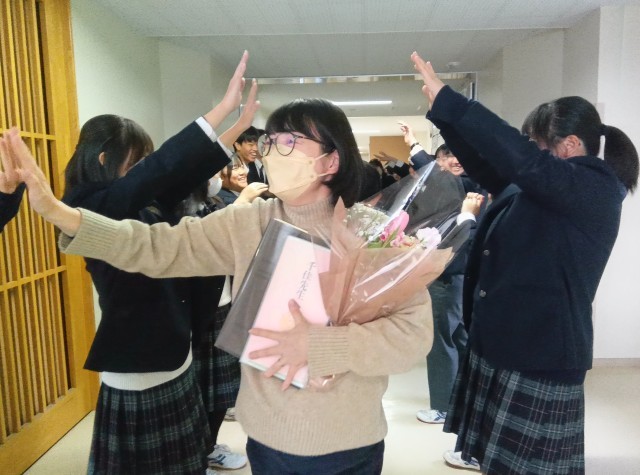 なんと、「先生を送ろうプロジェクト」には続きがありました。生徒たちがアーチをつくって体育館から職員室までの花道をつくったのです!「優しさいっぱい深沢中学校」いいですね!