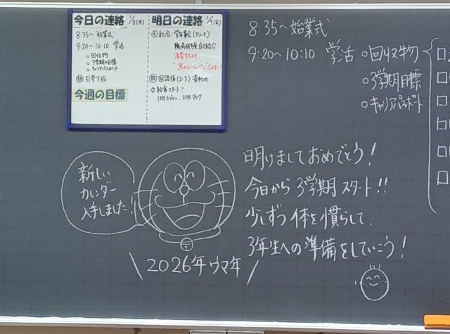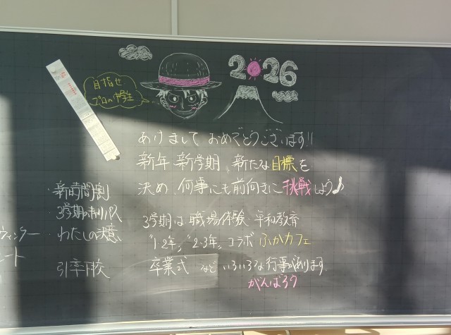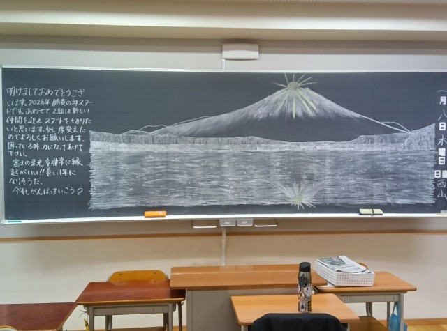 1月8日、3学期のスタートです。寒さは厳しいですが、青空が広がり、ピロティからは遠くに雪をたたえた富士山をのぞめます。黒板に、3学期を迎える生徒たちに熱いメッセージが描かれている教室もありました。さあ、次のステージに繋がる3学期、一日一日を大切に過ごしていきましょつ!