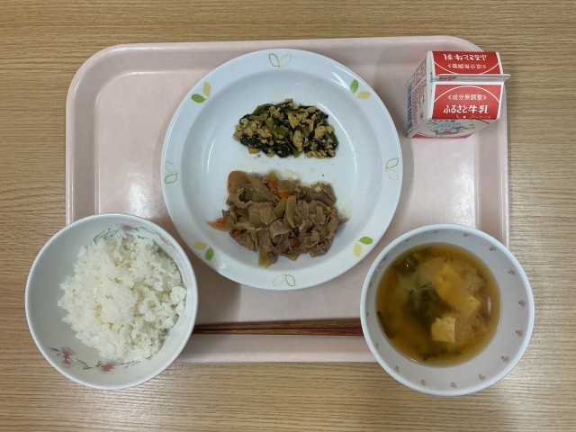 今日の献立・・・ご飯、豚肉の生姜焼き、小松菜と卵の炒め物、味噌汁、牛乳