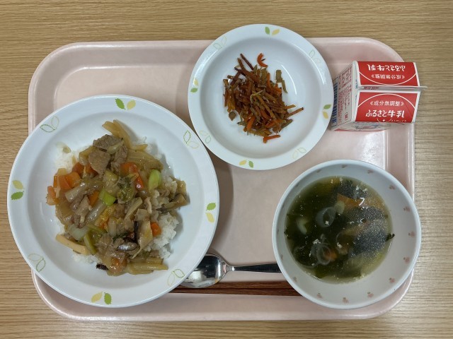 今日の給食・・・中華丼、かえりきんぴら、わかめスープ、牛乳