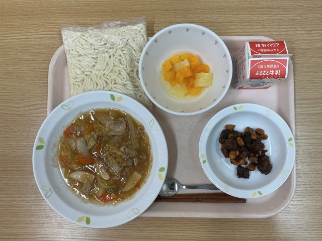 今日の献立・・・ソフト麺五目あんかけ、鯨と大豆の甘みそがらめ、ミックスフルーツ、牛乳