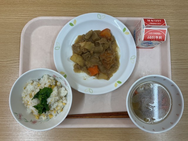 今日の献立・・・菜の花ごはん、五目うま煮、かしわ汁、牛乳