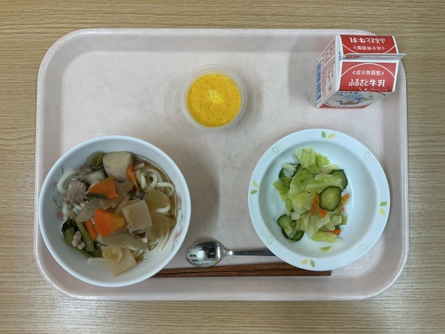 今日の献立・・・けんちんうどん、野菜の甘酢和え、パンプキンプリン、牛乳