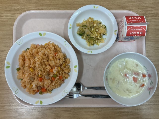 今日の献立・・・ピラフ、イタリアンサラダ、クリームシチュー、牛乳