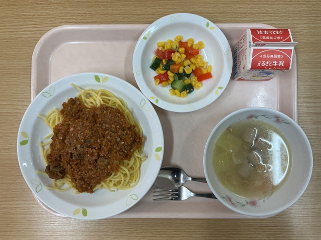 今日の献立・・・スパゲッティミートソース、トロピカルサラダ、ポトフ、牛乳