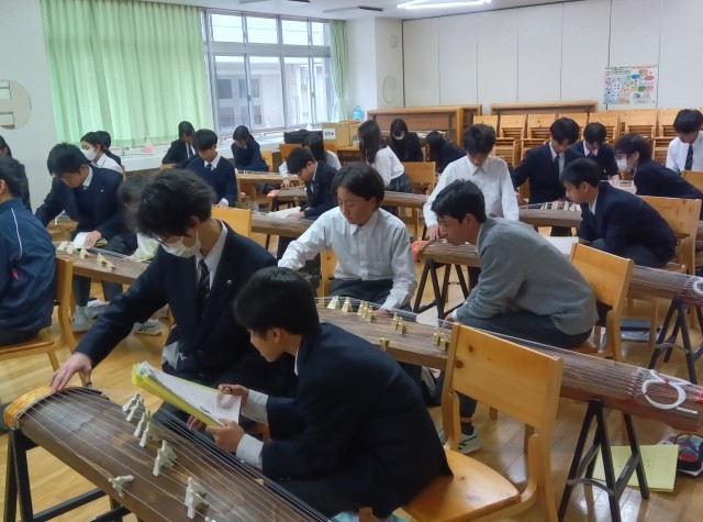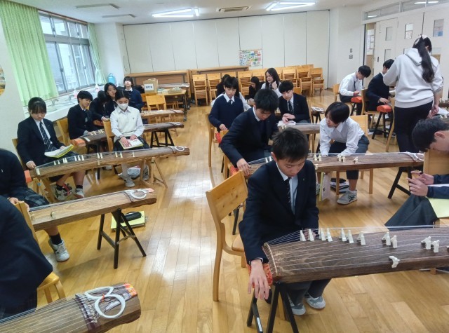 1年生が和楽器(箏)の演奏に取り組んでいます。チャレンジしているのは「さくらさくら」。みんな真剣そのものです。美しい琴の音が、ランチルームに響きます。