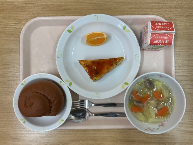 今日の献立・・・ココアパン、カスタードチキン、じゃがいもニョッキのスープ、清見オレンジ、牛乳