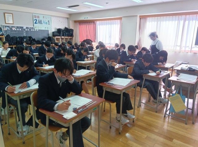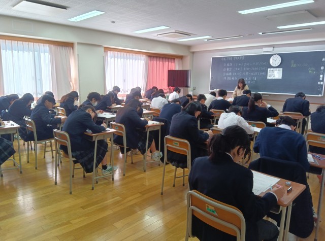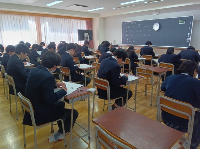 今日から1.2年生は学年末考査に臨んでいます。今は数学の時間です。みんな集中して問題に取り組んでいます!