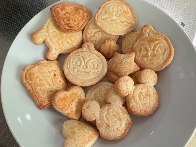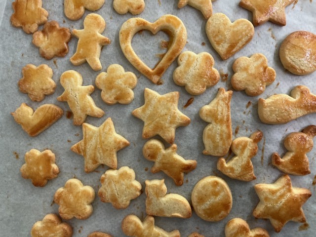 型を家庭から持参したため、いろいろな形のクッキーが焼き上がりました。