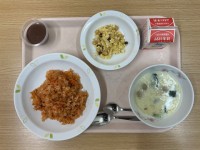 今日の献立・・・豚キムチ焼きそば、卵とわかめのスープ、フルーツヨーグルト、牛乳