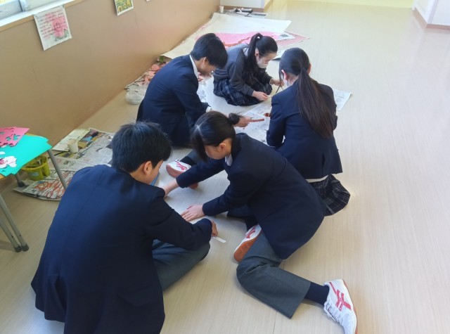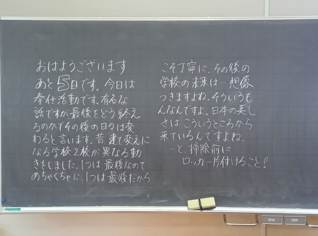 卒業式を5日後に控えた朝、3年生の教室の黒板には担任の先生からのメッセージが書かれていました。2年生のフロアーでは、2年生の学級委員が集まって、3年生へのお別れメッセージ制作を進めていました。学校全体が3年生の卒業に向けて動き出しています。