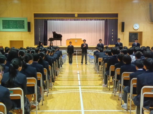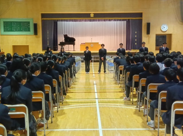 予告の前には、2年生のリーダーが「自分たちの手で3年生にとって最高の卒業式を創り上げよう!」と1.2年生に語り、3年生のリーダーは「素晴らしい卒業式をつくるために協力してほしい」と、1.2年生に訴えかけました。気持ちと気持ちが重なります。きっと心に残る卒業式になるでしょう。