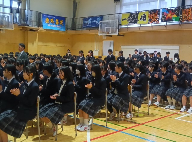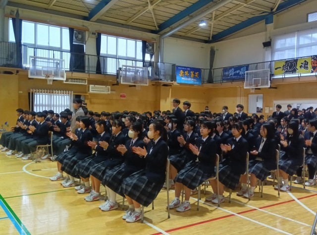 入場時の音楽は、吹奏楽部が担当します。みんな一生懸命拍手しています!