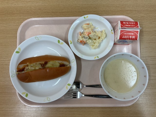 今日の献立・・・チリビーンズドッグ、ポテトサラダ、クリームコーンスープ、牛乳