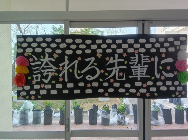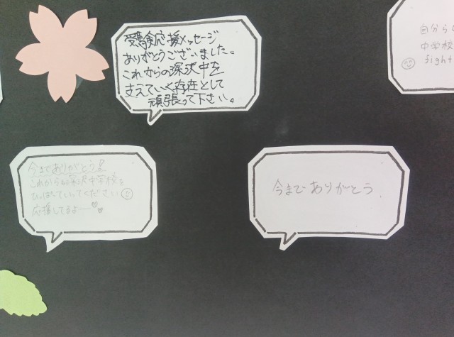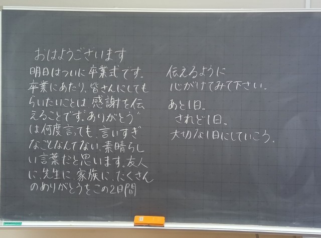 卒業式前日。3年生の教室黒板には明日の卒業式に向けて、担任からのメッセージが書かれていました。1.2年生の昇降口には3年生から1.2年生に向けたメッセージが貼られていました。明日の卒業式に向けて思いが重なります。