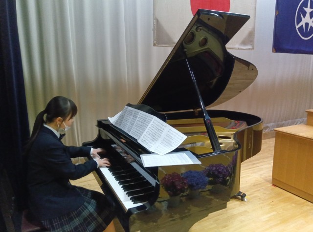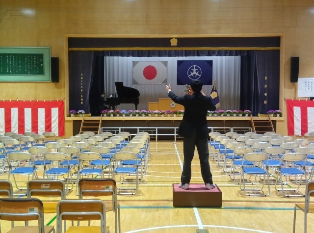 卒業式の朝。誰もいない式場で、3年生全体合唱の指揮と伴奏者が、最後の練習をしていました。3年生の思いが、歌声に乗ってアリーナ中に広がりますように。