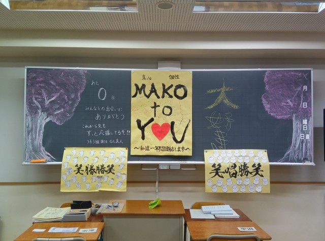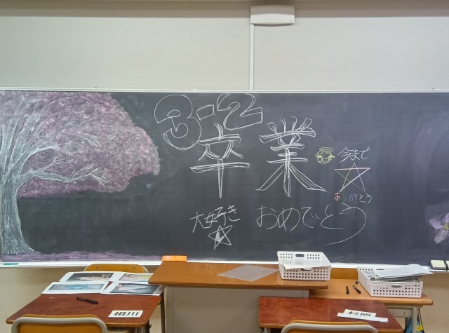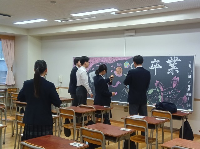 卒業式の朝、黒板アートを描くために少し早く登校した生徒たちの姿が。いよいよ今日が中学校最後の登校です。