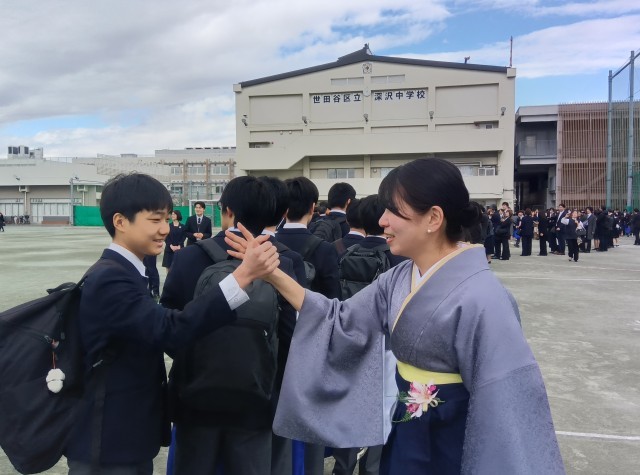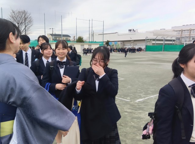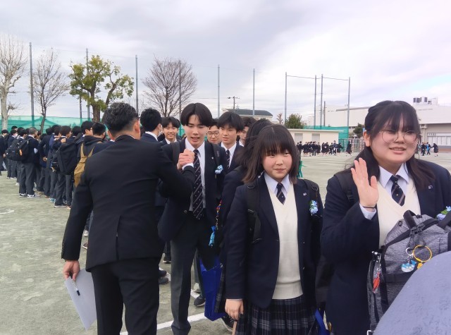 先生たちも、笑顔と涙で生徒たちを見送ります。