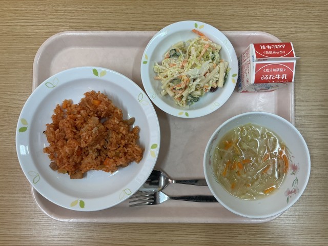 今日 の献立・・・チキンライス、マカロニサラダ、ジュリアンヌスープ、牛乳