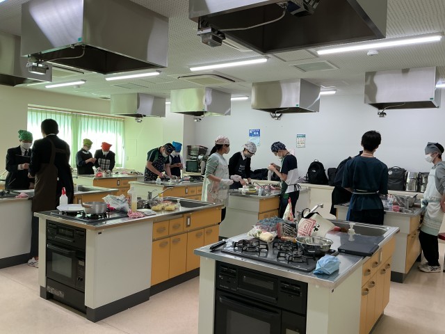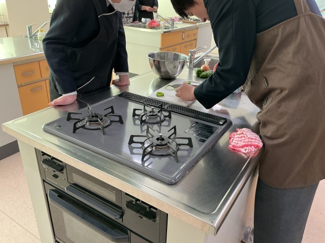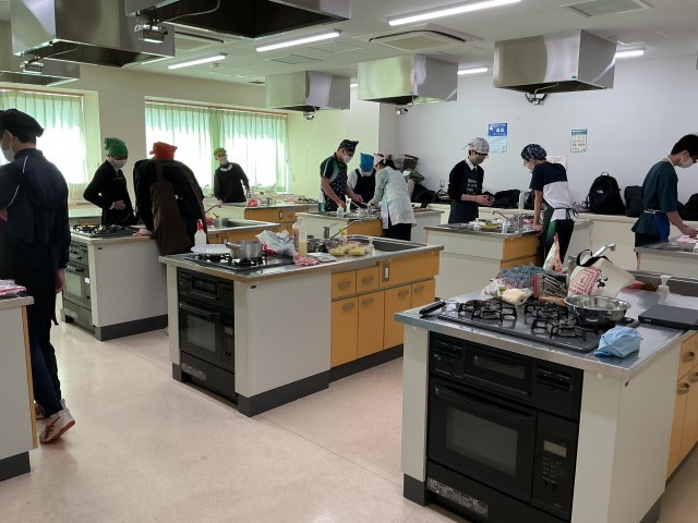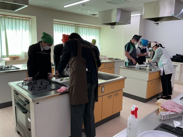 春休み中も、いくつかの部活が元気に活動しています。その中でも、調理室では技家部、科学部合同で三送会としてピザ作りが行われていました。上手に食材を切っています。