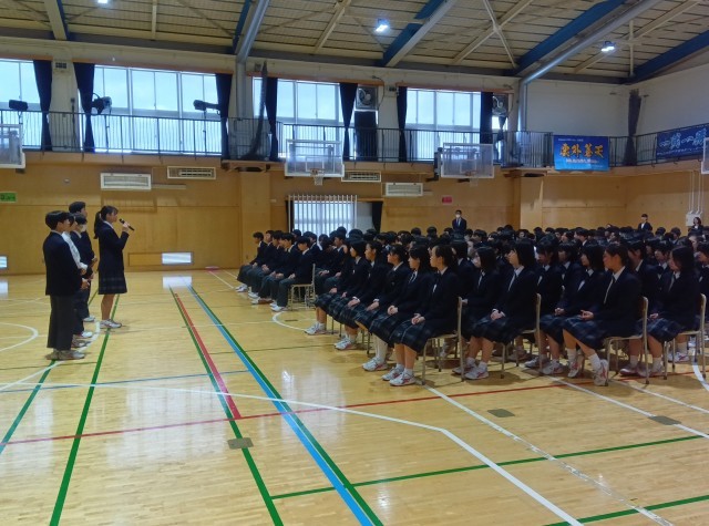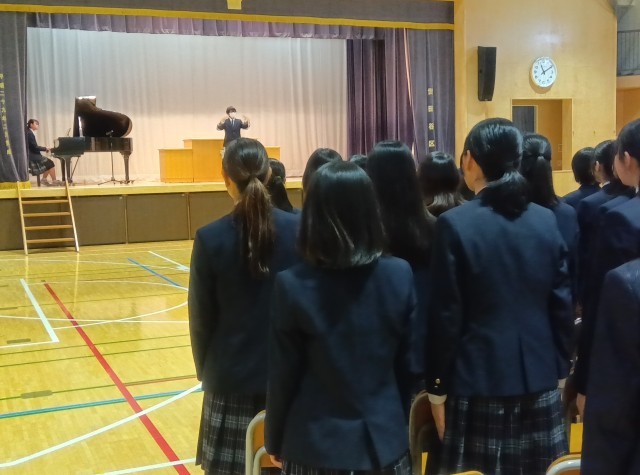 明日の入学式に向けて、2.3年生が事前練習をしています。最初に、3年生の代表生徒たちが、入学式に向けての心構えと、式中に歌う「校歌」と、「新入生歓迎の歌」を気持ちを込めて歌ってほしいと、2.3年生に訴えかけました。明日、2.3年生の歓迎の気持ちが伝わる、心温まる入学式になりますように!
