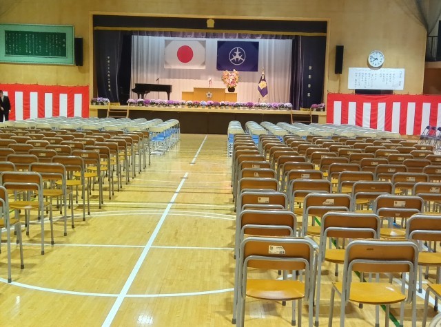 入学式の朝です。教室、体育館アリーナなど、新入生を迎える準備は万端です!