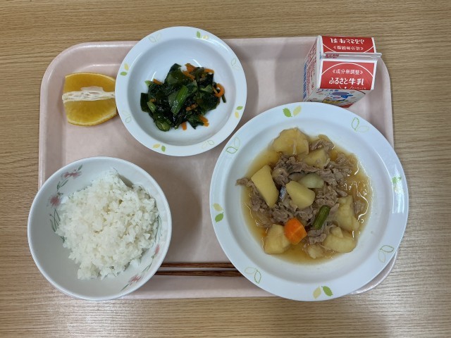 今日の献立・・・ご飯、肉じゃが、和風サラダ、河内晩柑、牛乳