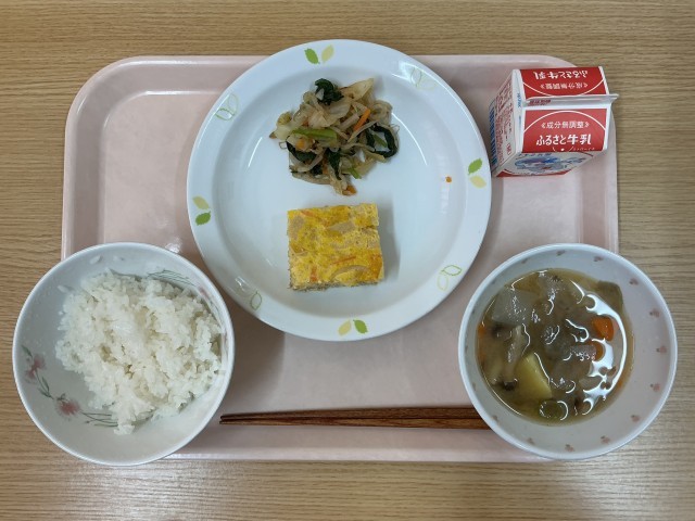 今日の献立・・・有機米のご飯、五目卵焼き、わさび和え、田舎汁、牛乳