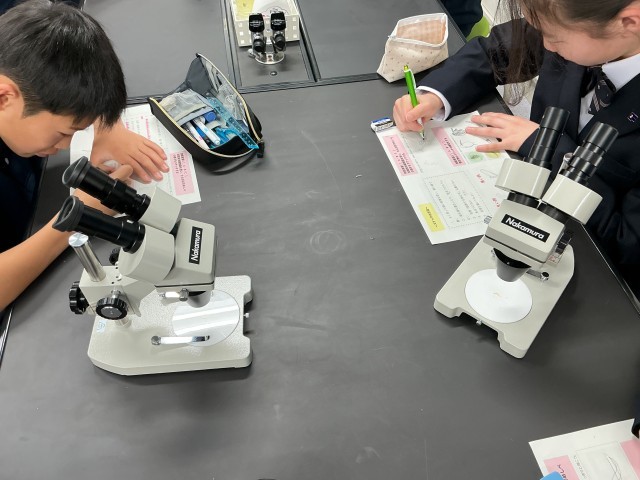 1年生の理科の授業では、双眼実体顕微鏡の使い方を学習しています。
