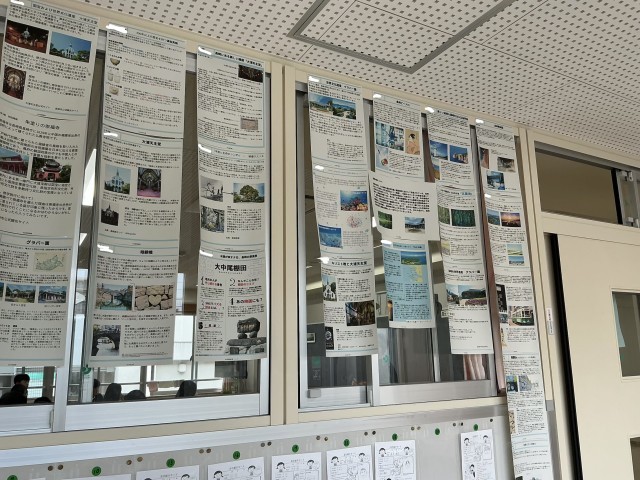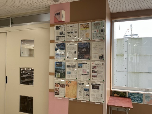 3年生の廊下に修学旅行の調べ学習が掲示されています。
