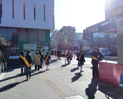 ○11日(月)に、桜新町駅前で駅前放置自転車クリーンキャンペーンが行われました。 生徒会役員はじめ、ボランティアが15名参加し、自転車を放置しないように呼びかけ ました。