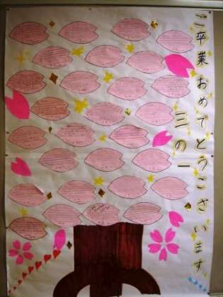 ○卒業間近の三年生に在校生からお祝いの言葉が寄せられました。三年生の各教室の前に 貼りだされました。