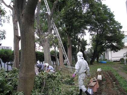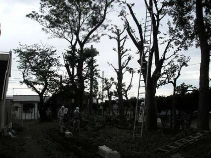 世田谷区の用務班の応援を得て、校地の西側・北側の剪定作業が行われています。