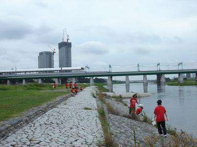 今年の参加生徒は、33名。校長他5名の教員と多摩川兵庫島周辺でのクリーニング(ごみ拾い)を行いました。
