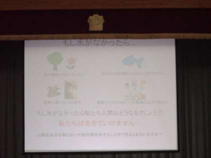 のどが渇いた時には既に体の水分の2%が失われているということ、水分補給は15〜30分おきに塩分と当分の含まれた水分を摂取することが望ましいこと、重度の熱中症である熱射病になった時に周りがどう対処するか等をクイズを交えながら教えていただきました。