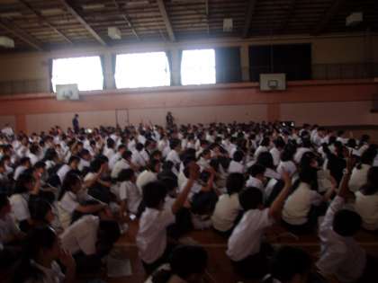 1〜3年生が体育館に集まり、講師のキング・アダム先生をお迎えして熱中症の対策指導が行われました。