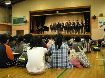 昨日、小学生見学会が行われ、深沢小と桜町小の子ども達が深沢中を見学しました。やや緊張した面持ちで校舎内の見学や授業の様子を参観しました。その後、体育館で生徒会による説明会が行われ、学校生活の紹介、部活動の紹介、作文朗読、また合唱コンクールの三年生のグランプリ受賞クラスによる合唱がありました。三年生の迫力ある合唱に圧倒された小学生でした。生徒会役員の進行もスムーズで小学生からの質問に温かく答えている姿が印象的でした。